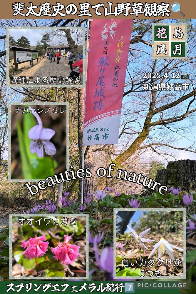 NHKの📺ドラマで一躍有名になった上杉景虎。実家の北条氏を頼って小田原城に逃れようとしたが孤立無援状態になりその途上において城主の堀江宗親の裏切り・謀反に遭い、自害した最期の地である鮫ヶ尾城🏯。その城址跡一帯の山を切り開き造られたのが斐太歴史の里で、縄文時代の遺跡も残る。ただ今は歴史的遺跡としてよりカタクリの名所で有名に。その歴史解説とともに自生する山野草✿の観察会が講師とともに沢山の地元スタッフのヘルプで開催され参加することに。教育委員会のバックアップもあり資料もバッチリ👌昨年は同時期に自分一人で🥾