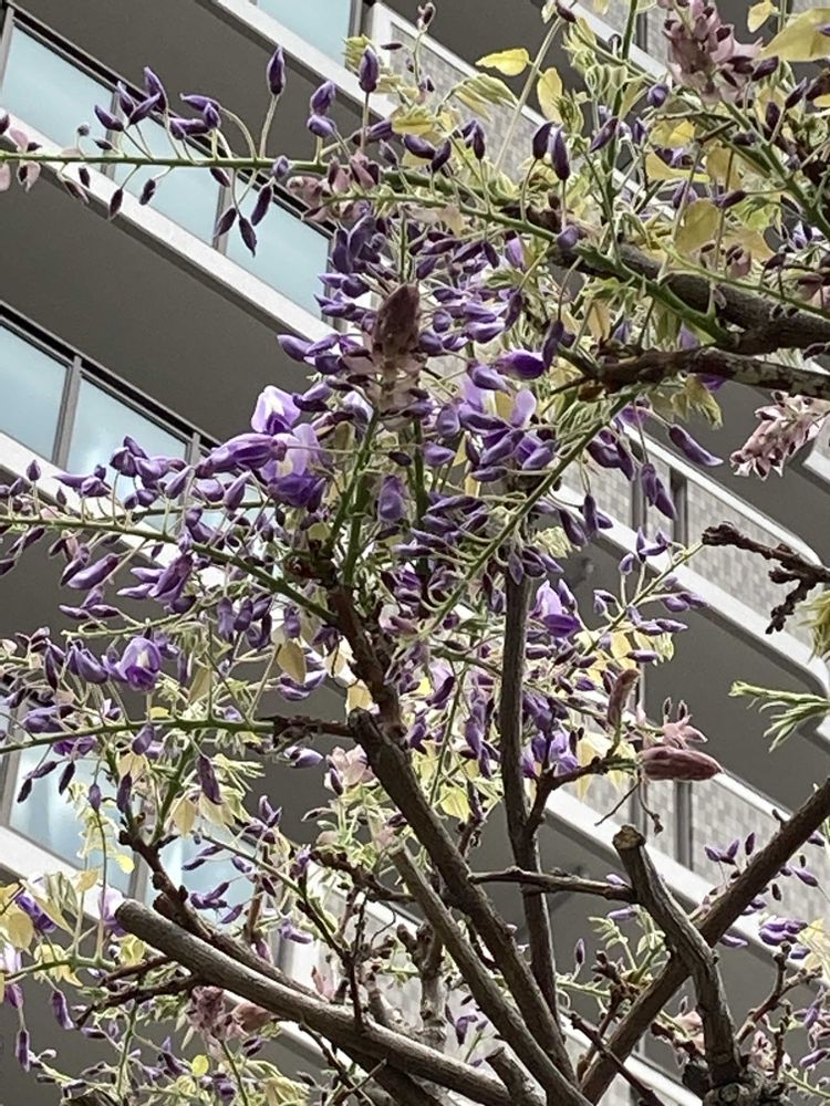 高層マンションのハナミズキの花と藤棚の藤の花が咲き出します♪