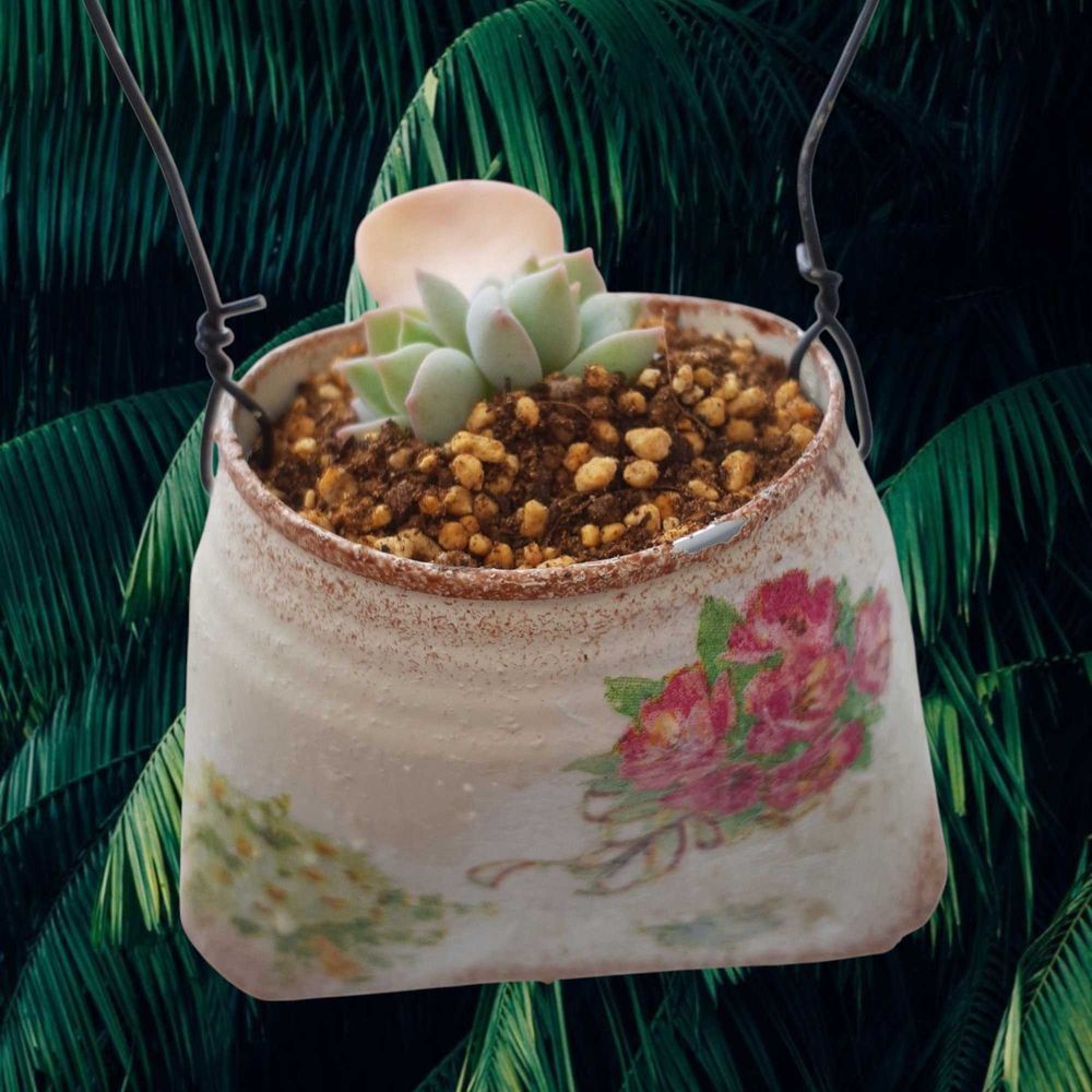 初めてのぶら下げる形のリメ缶で、土をこぼしながら😀💨