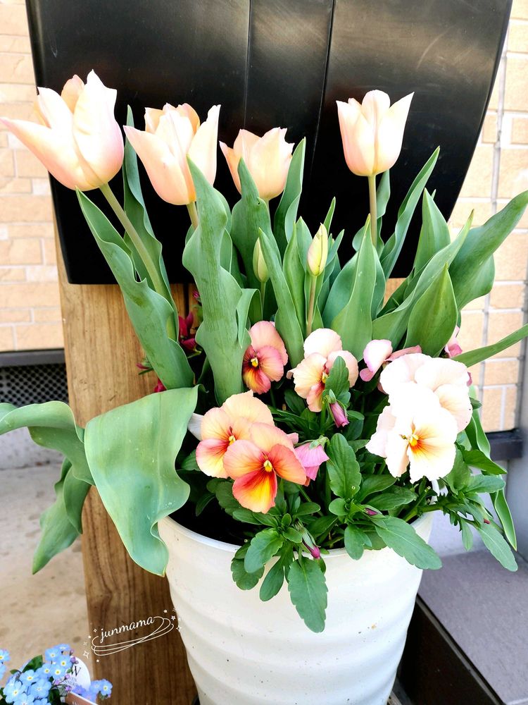 淡い色合いしたチューリップ🌷とパンジーの寄せ植えが可愛いですね😍❤️💕