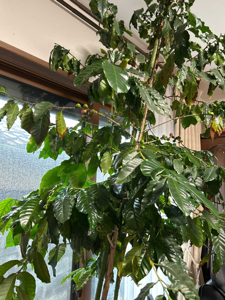 何年目のコーヒーの木でしょうか。とても立派な木ですね!実も沢山なっているんですね。素敵です!