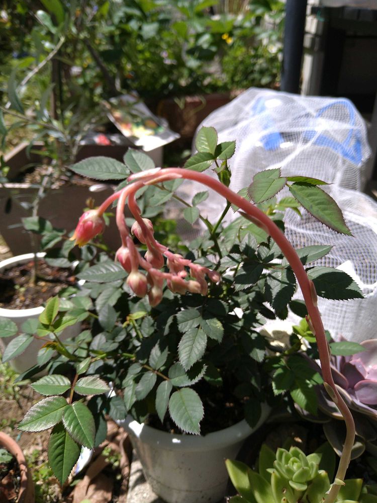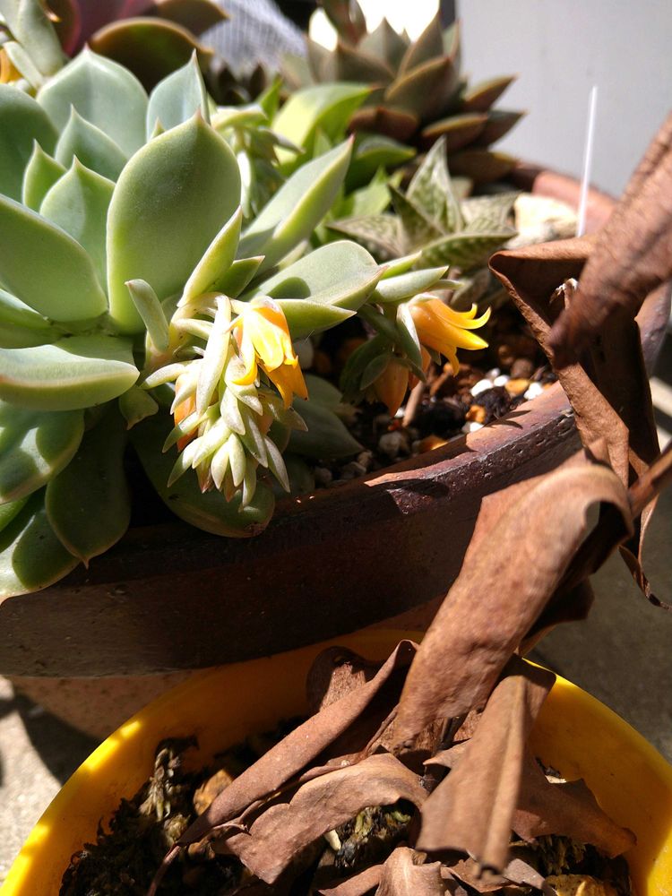 風が強くて肌寒い中、ローズマリーや多肉の花が咲きそうです。