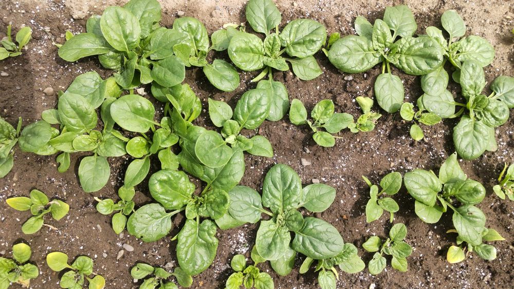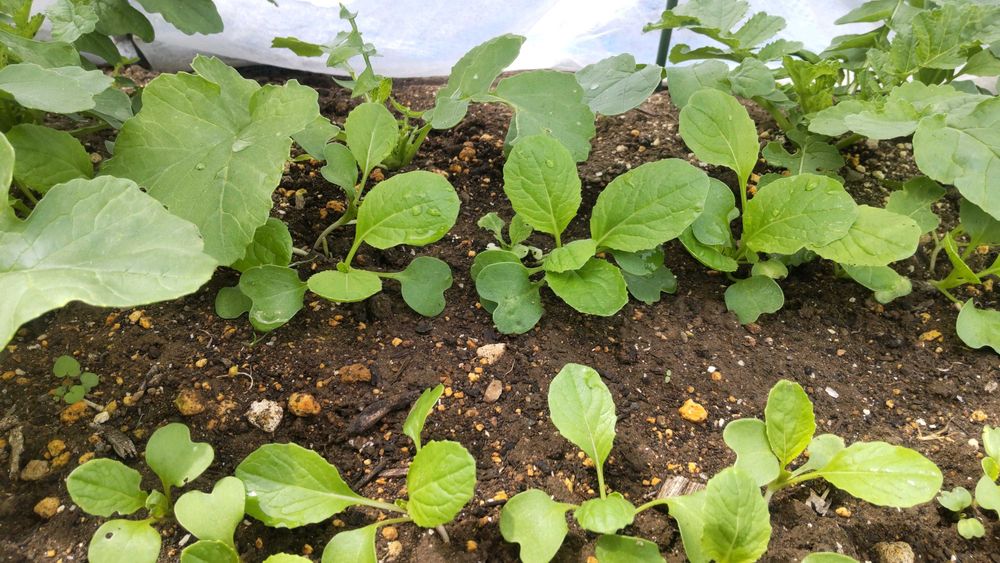 小松菜とダイコン、なかなか大きくなりません 大根は1本に間引きました 根はかなり深く成長している様子です