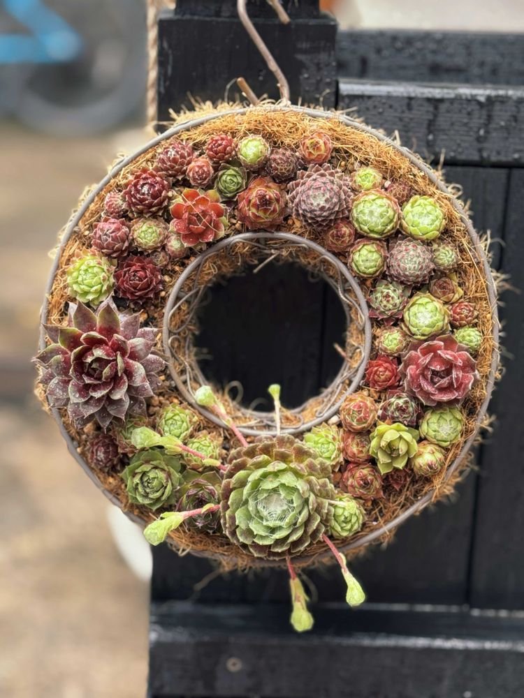私はセンペルビウムが好きで作ったけど色々な植物で作るのも楽しいと思います😄今度はセダムでとかで作ってみようかと考え中🎶小さめのリースだと色々な所に飾れていいですよ💚🩵