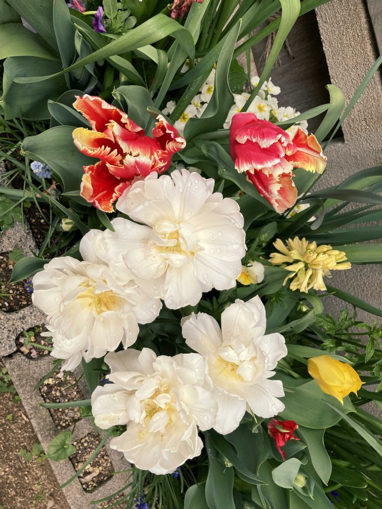 3→八重咲チューリップがバッカーン🤣冬場はいい感じだったのに、球根植えすぎやった💦
