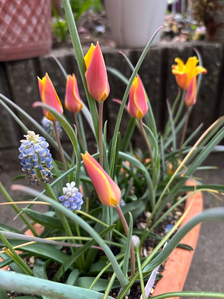 5球入の球根でしたが、花たくさん咲いてくれました。同じ植木鉢に植えた3種類のムスカリと同時期に咲いてくれればいいなと一緒に植えましたが、ムスカリも一種類ずつ咲き、チューリップが咲く時には、最後のムスカリも終わりがけでした。