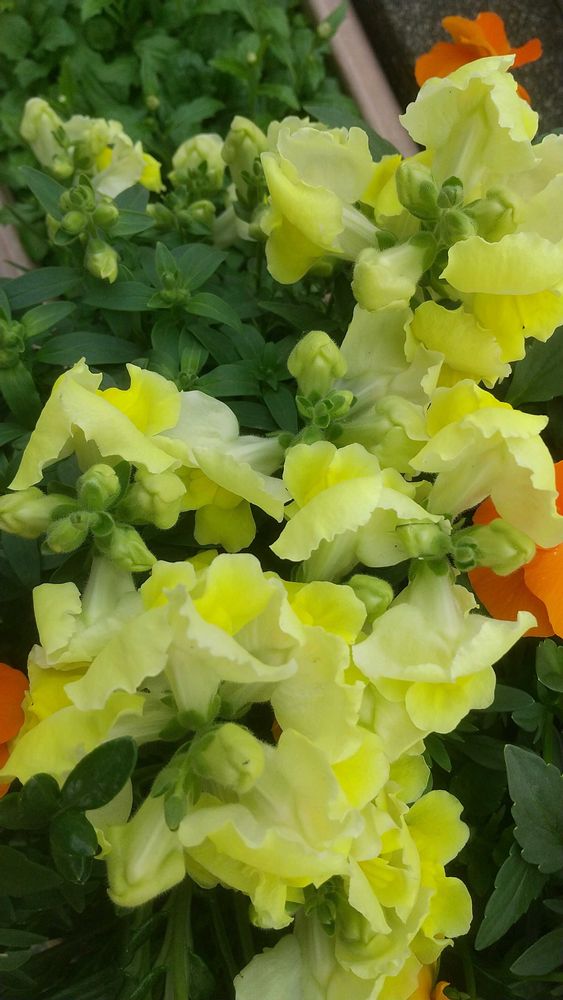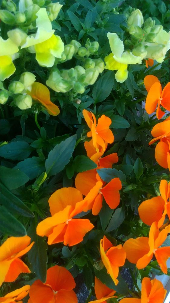 黄色のキンギョソウは、黄色のガザニアとオレンジ色ビオラと一緒です。😄