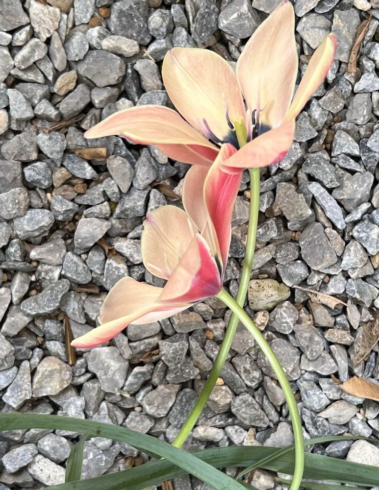 外はピーチ色、開くと中はクリームイエローのバイカラーでとてもかわいいです。が、日当たり悪いうちの庭では暴れて地面スレスレに咲いてます😅