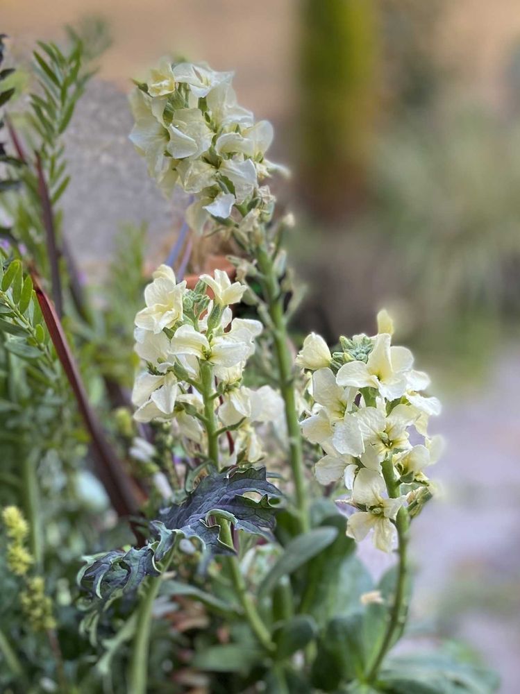 後ろのアカシアブルーブッシュ、一重のストック、エリカホワイトデライトがのびのびしてきました