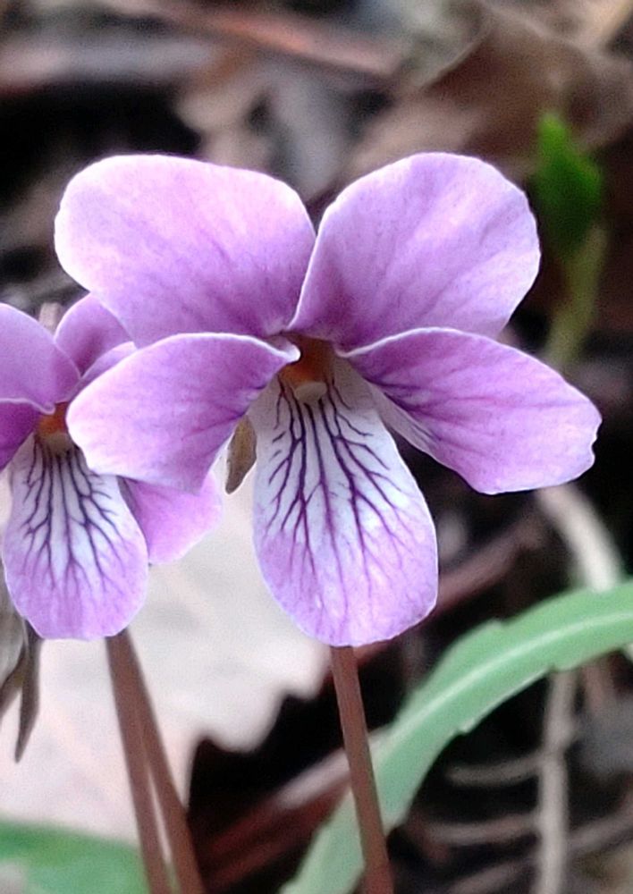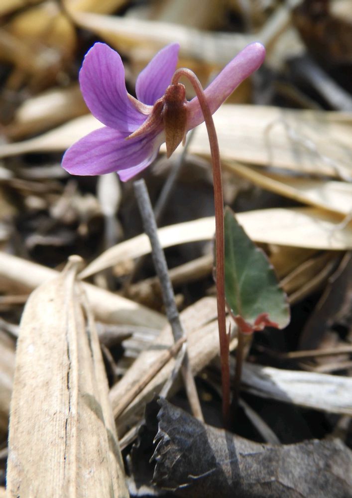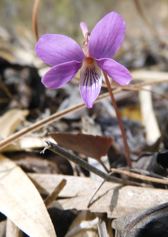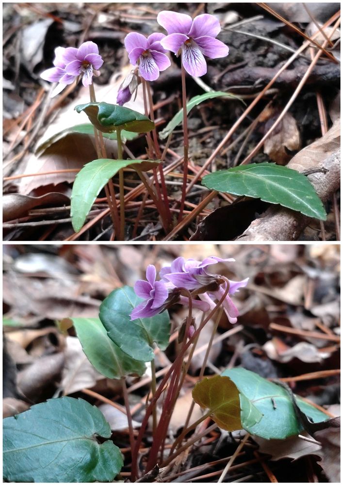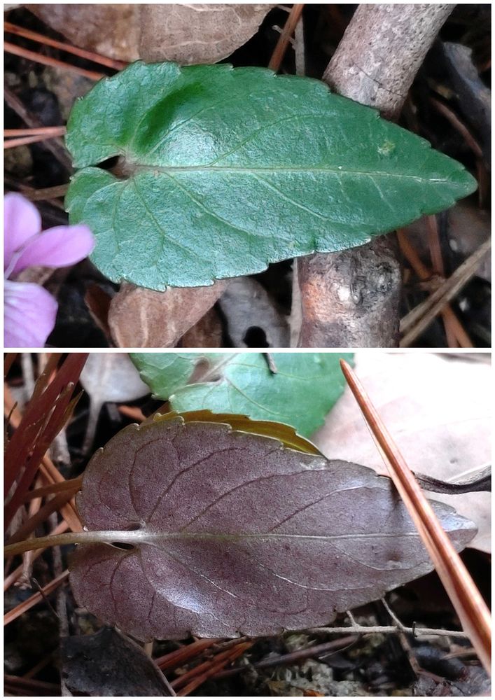花は赤みを帯び、濃淡に幅があります。側弁基部は無毛で、全体に毛のない印象です。名前のとおり、葉の裏は紫色を帯びます。