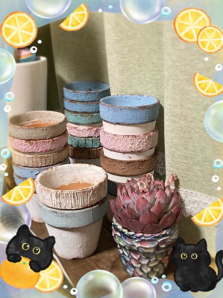 これらは、数年前のデコパージュした鉢が汚れたり薄くなってカッコ悪くなった鉢を塗っただけ🤭