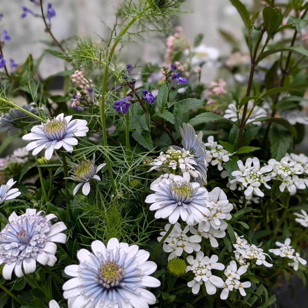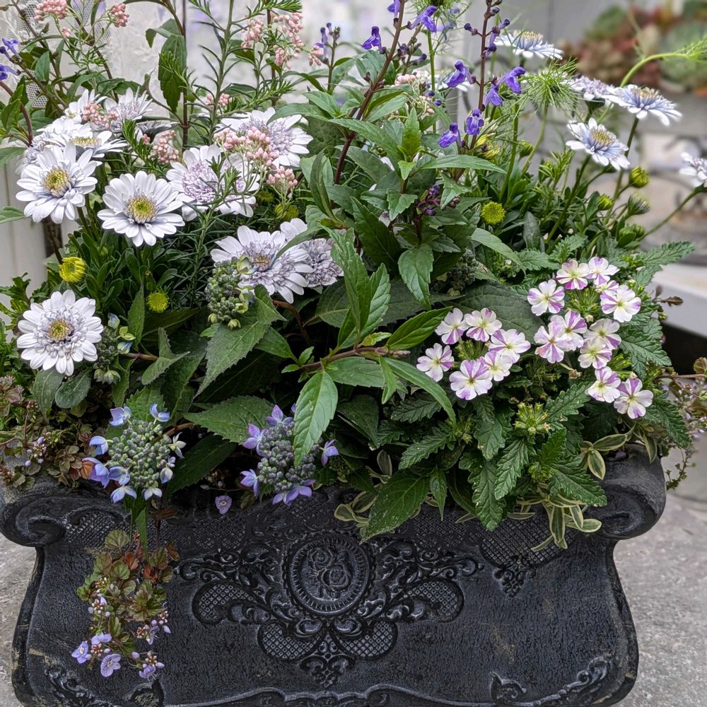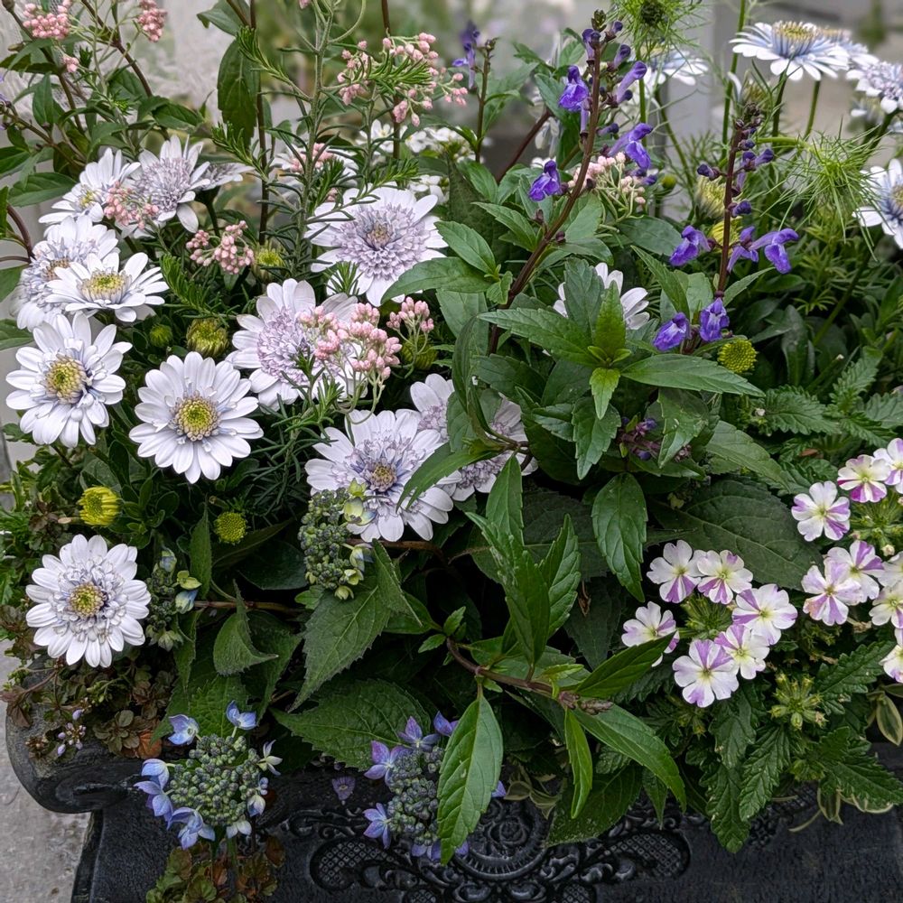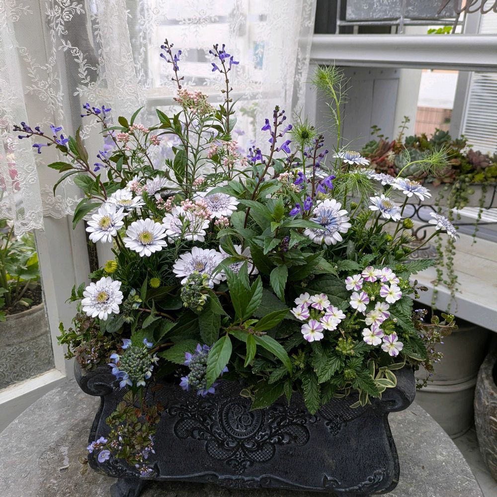 シックなプランターに合わせてクールな色合いのお花をブリコラージュしました😉