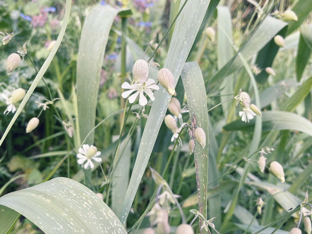 バルセロナ郊外の森の入り口で。後ろに見えている青色はボリジ。ほんとうに白玉みたい!🫧🫧🫧