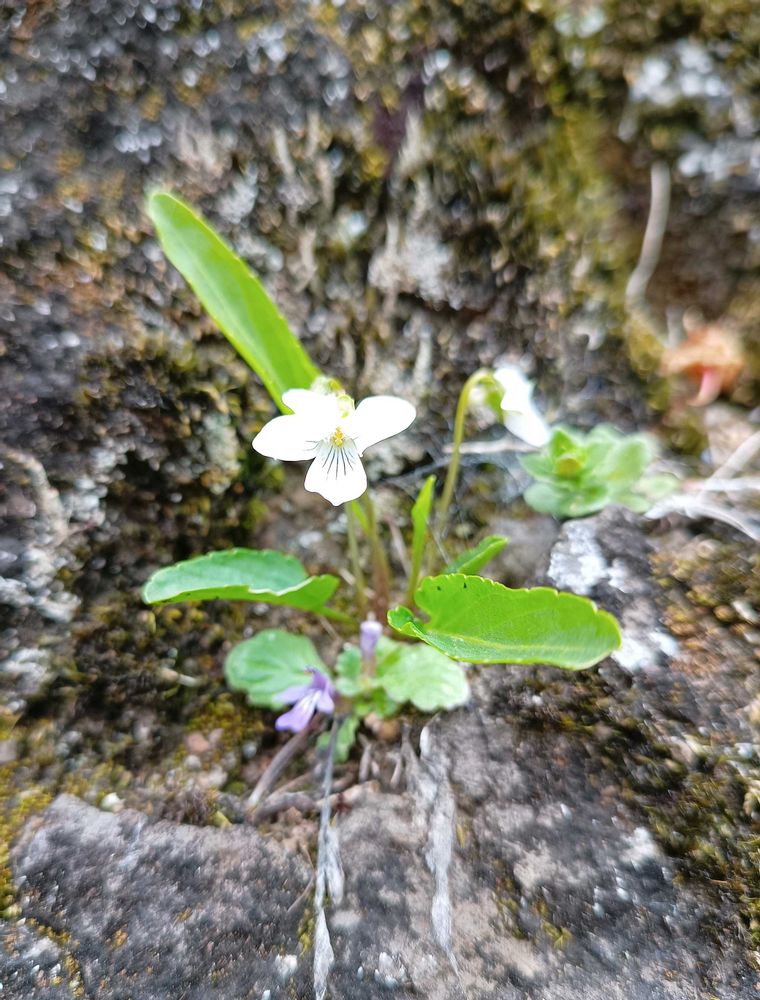 神社の駐車場近く石垣の間から白いスミレが咲いていました。