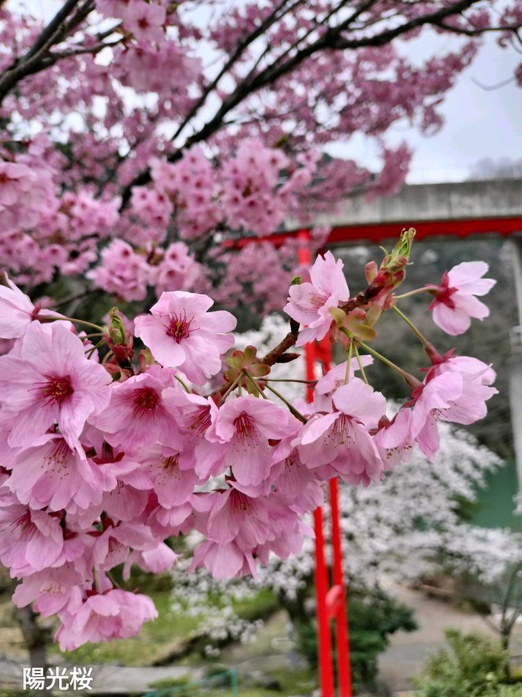 ①濃いピンクの陽光桜が満開でした、いつもなら、ソメイヨシノが先に咲き散った頃に咲くはずが、今年は、ソメイヨシノの開花が遅かったのでコラボで見ることが出来ました、