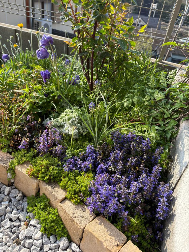 野原っぽくなったかな?去年植えたアジュガがしっかり広がって森のように。少し密集しすぎかな?オルレアを少し間引いてカラドンナに日が当たるように調整。