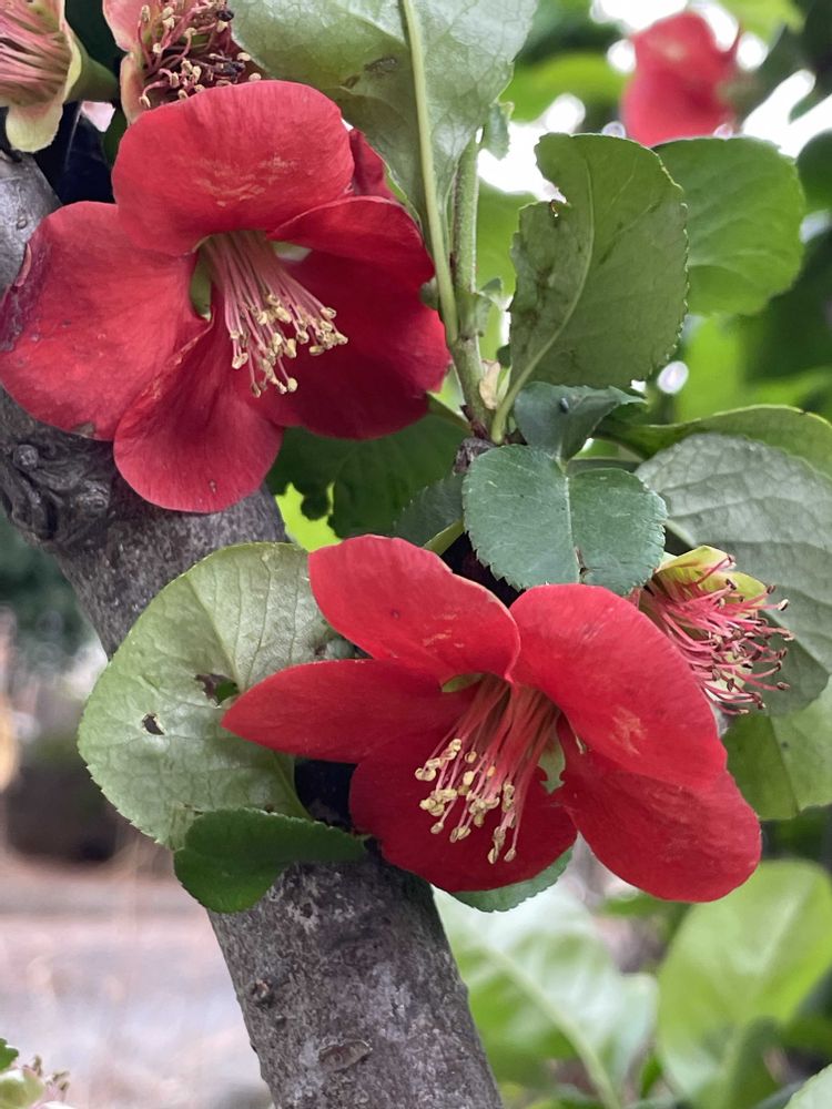 遠くからでも真っ赤な椿と木瓜の花が咲いてるのがわかり、楽しい