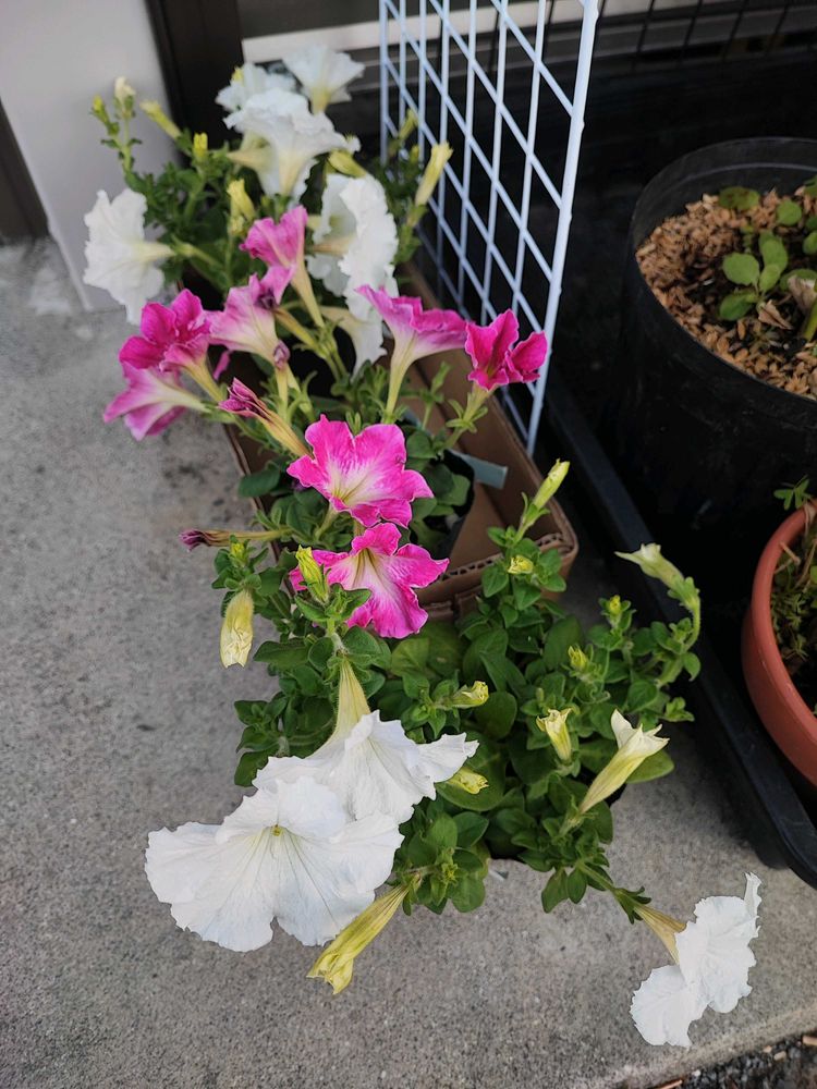 昨日ナフコで88円の名札なしペチュニアを3株購入。多分エコチュニアかな~と思います。良き株を選べてホクホクです。去年値下苗で購入し、とてもよく咲いてくれて冬越しもしたスーパーチュニアのロリポップさんが大きくなってきている&挿し芽で増えたので、ペチュニアはもう十分かもしれない。カリブラコアは本当に相性が悪いので全然ダメ(すぐ枯らす)なのですが、ペチュニアはまだなんとか...
