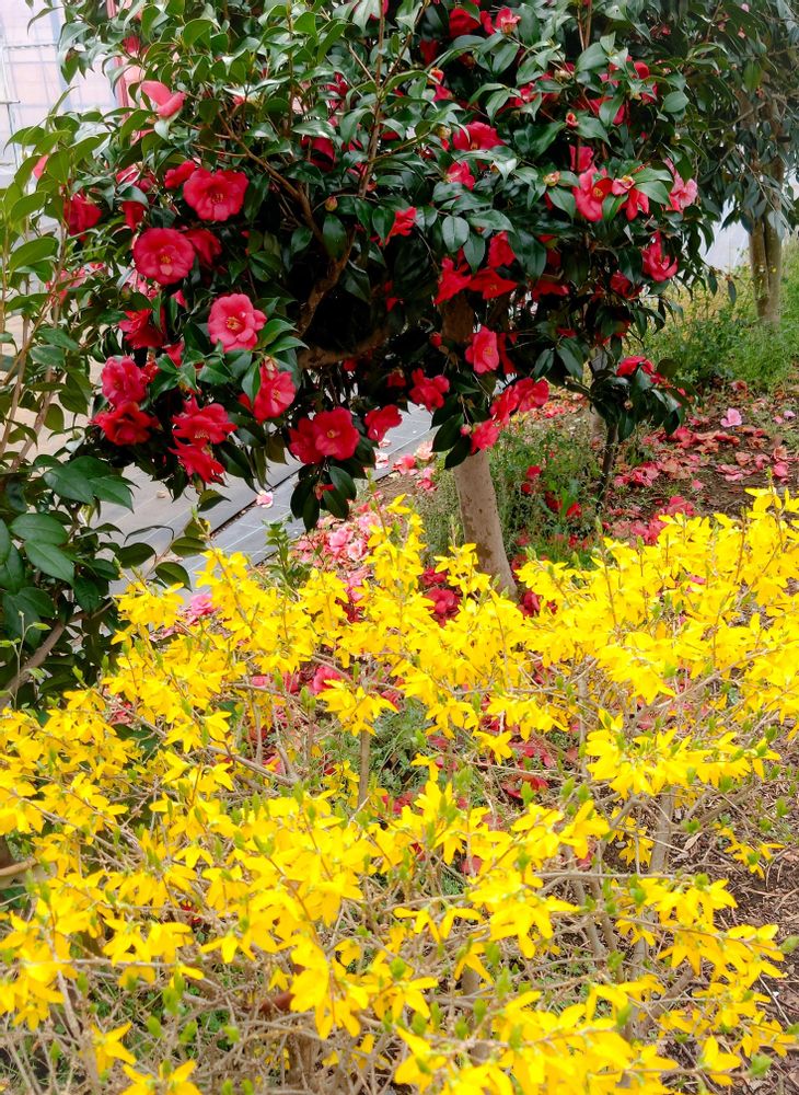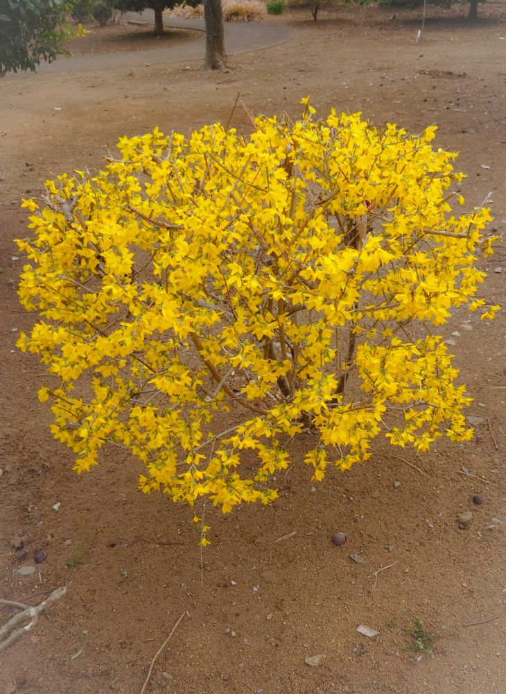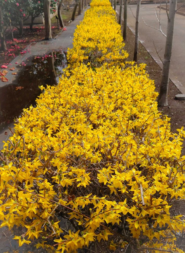 生け垣にしたら幸せになりそうですね🤩 いつもの散歩コースも、今日のテーマ「レンギョウ」が黄色い世界をつくり出していました🙌(農業試験場内にて)