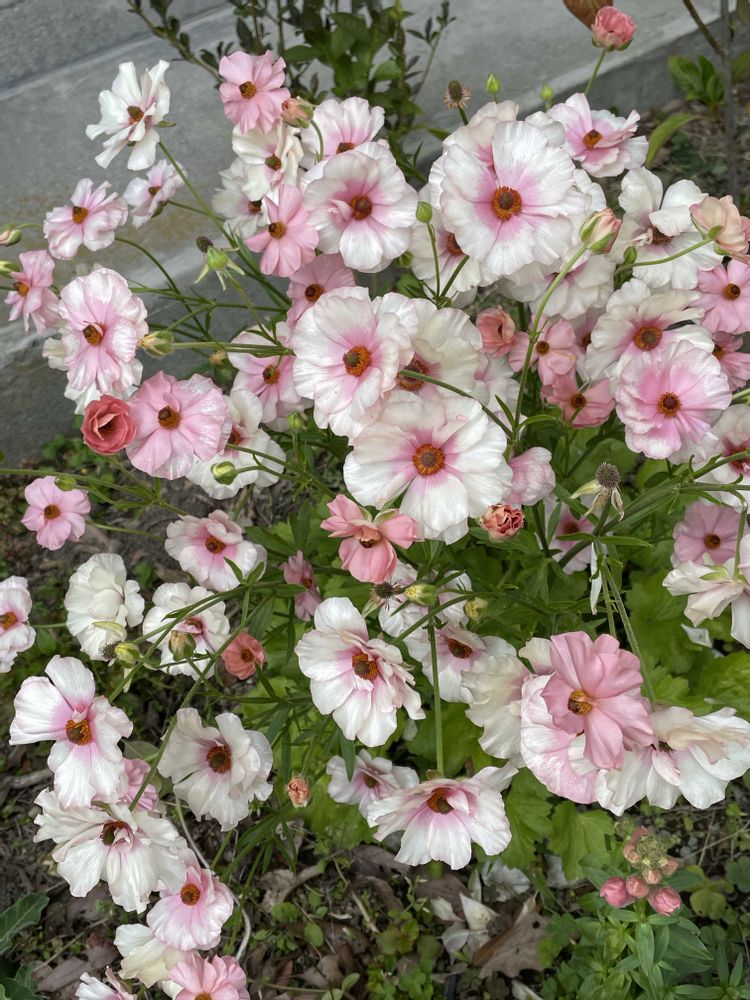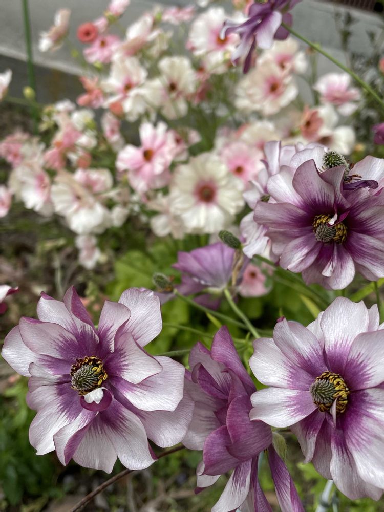 ラックス植えっぱなしで毎年🩷💜💛咲くよ😆 夏は、地上部が枯れてしまうので、まぁ〜るく小石置いている