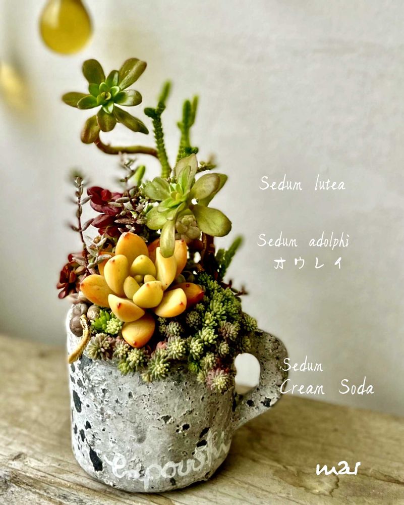 棒ローズ茎が見える様に足元は空けて起きたかったんだけど、つい少し余りセダムを足すと、春はあっという間に増殖よね🤣