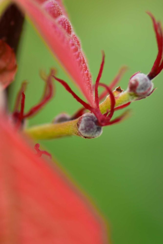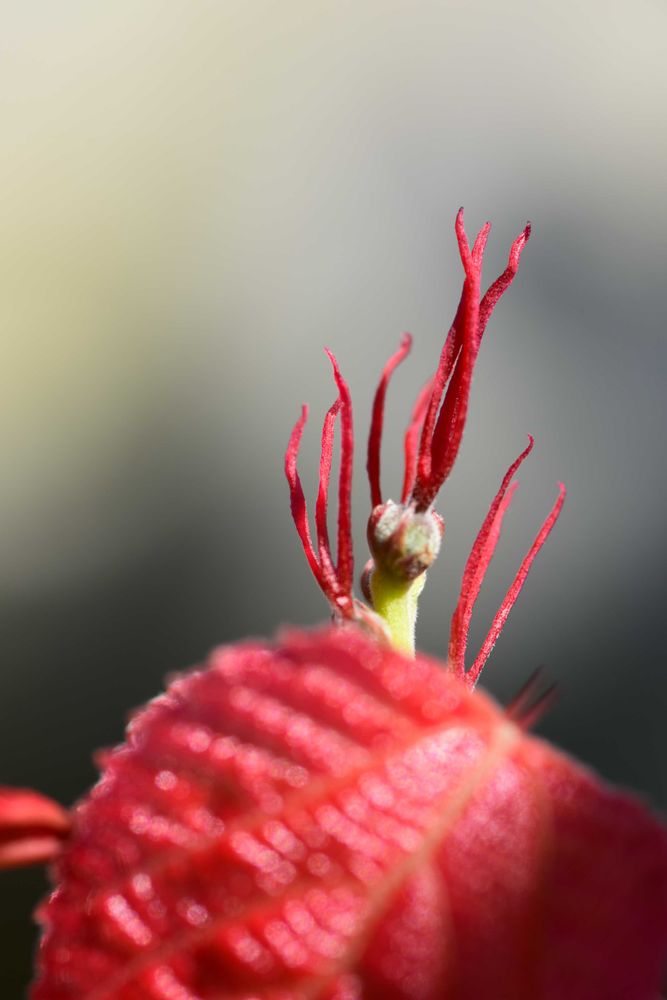 雌花は、花弁はなく、赤い紐状の雌蕊が伸びる。紅色の奇妙な形の花です