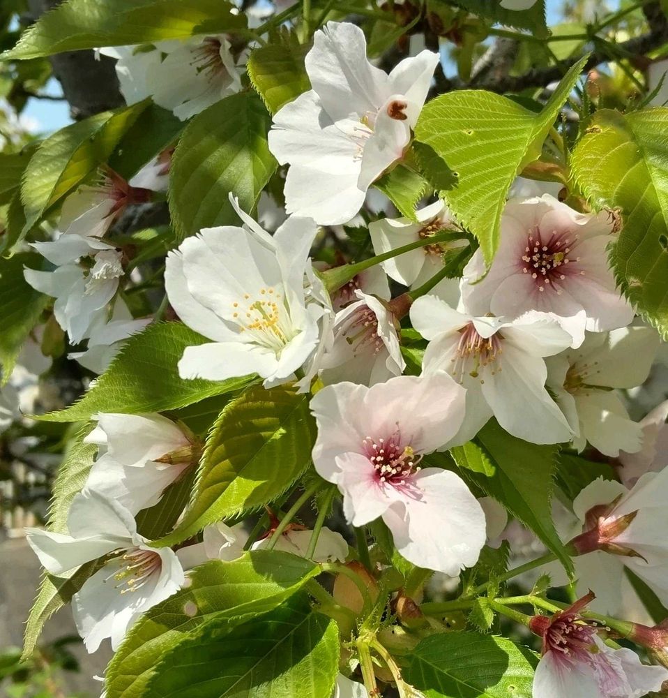 川沿いの桜並木の中に白いオオシマザクラが数本あったのですが、その中に中心がピンクになっている桜がありました。