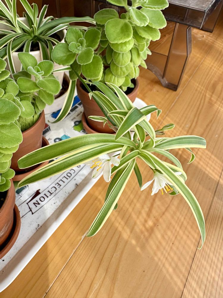 オリヅルランの子株のところに2つ花が咲いてキレイ💕