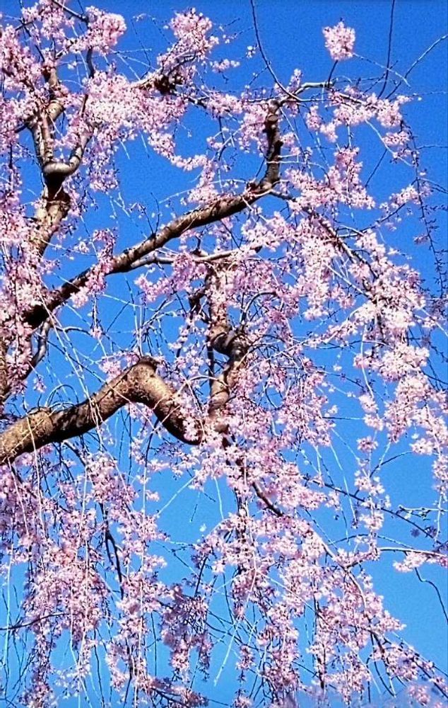 ①青空にピンク色の枝垂れ桜🌸が風に揺