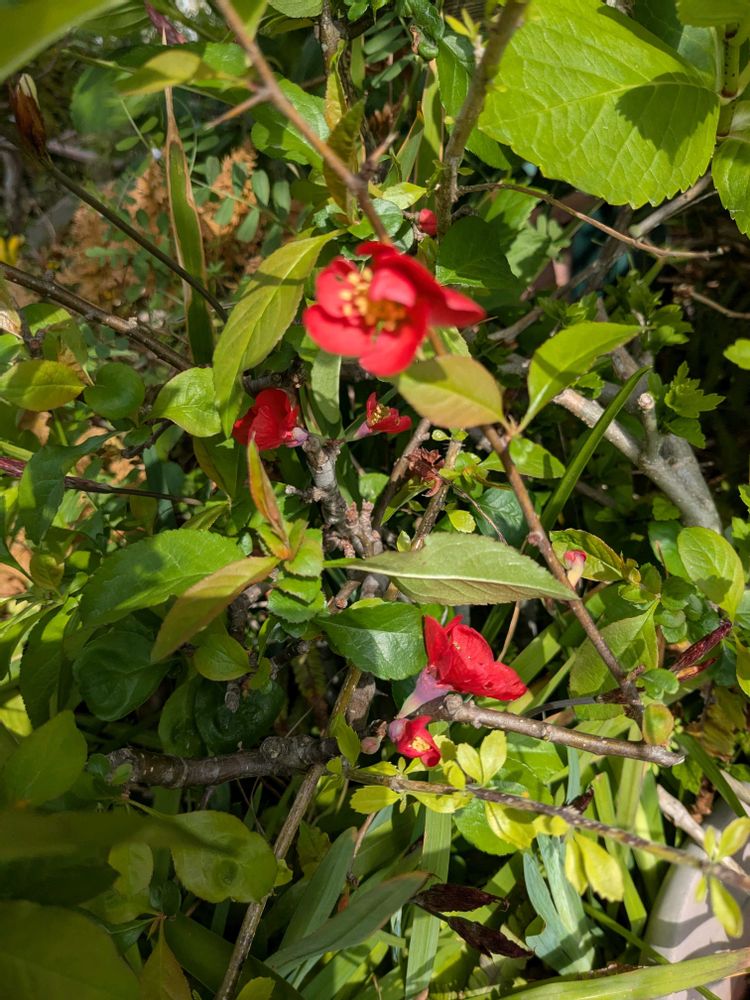 木瓜の花。毎年花が咲いて。終わり頃、剪定かけてるから、玄関前もコチラも小さいままに年越されてます。何年移住されているのか?です。😅🙄