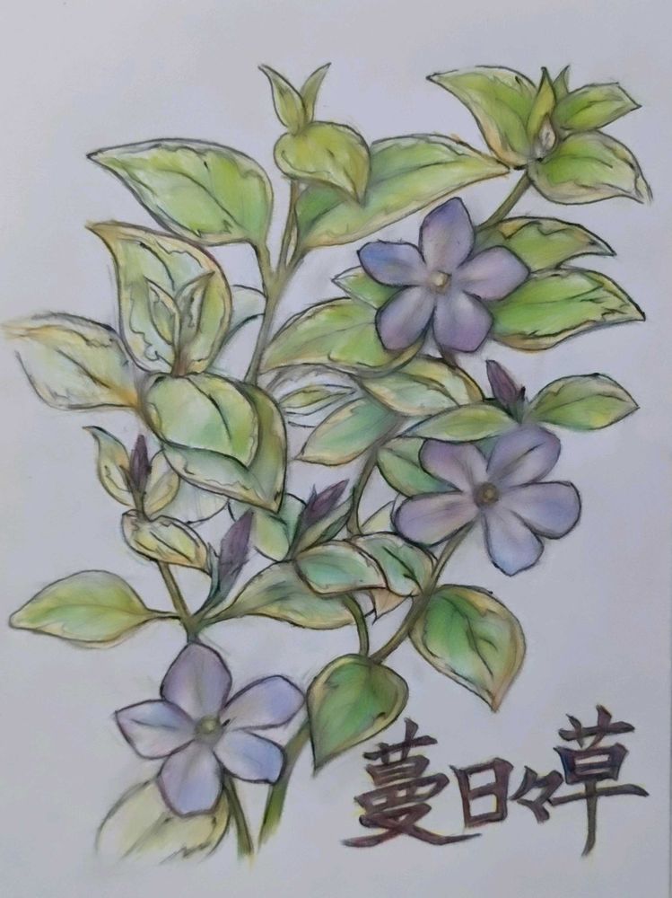 ツルニチニチソウの絵、色使いがとっても綺麗で素敵ですね🍀🌸