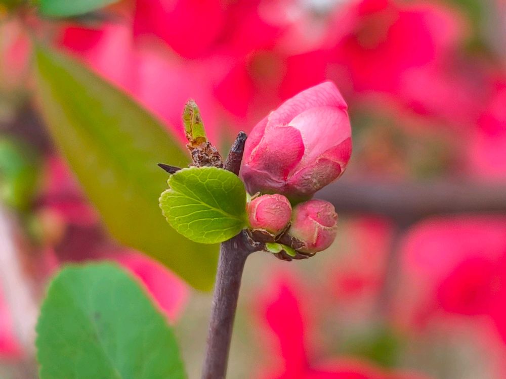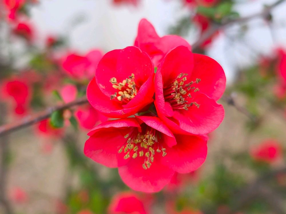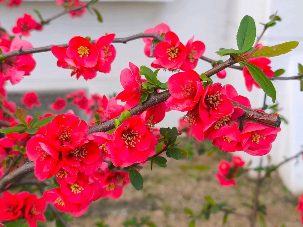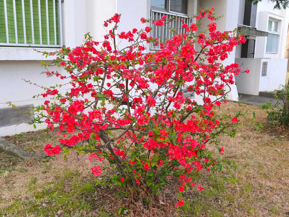 家近くの団地の敷地に赤色が強烈に目立つ木瓜があるのですがそれが満開状態に✨