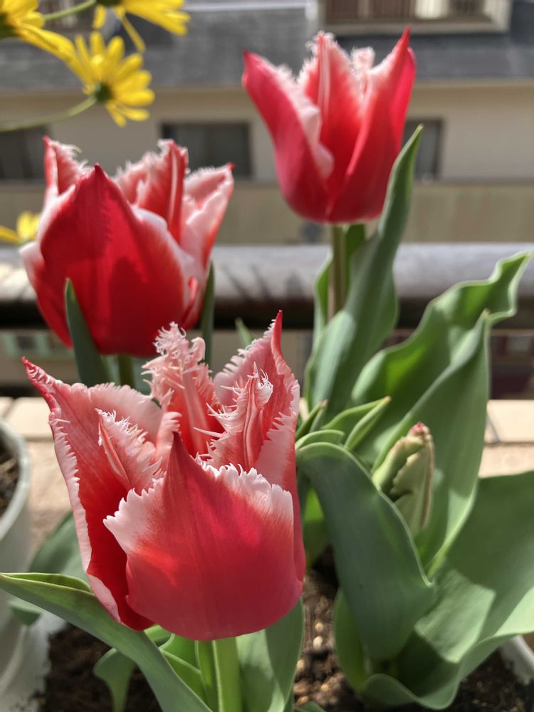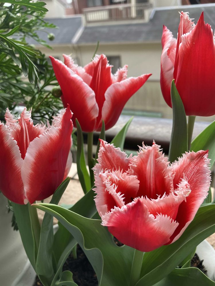 赤に白のフリンジが可愛いチューリップです🌷🌷今年も咲いてよかったです🎶