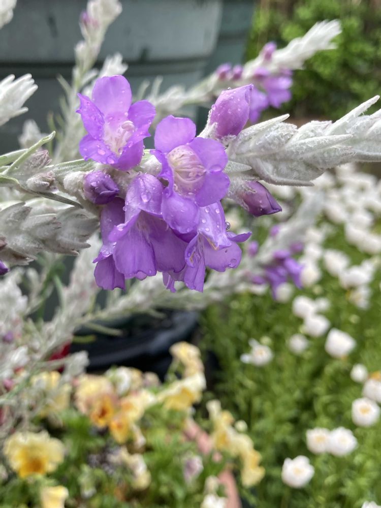 エレモフィラ ニベアでしょうか😃スモーキーな葉っぱと薄い紫がマッチしてフワフワ感も素晴らしいですね🤩❣️
