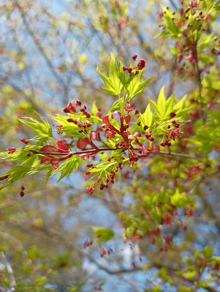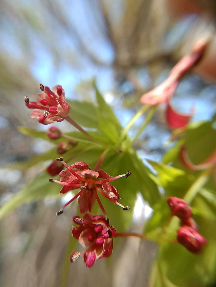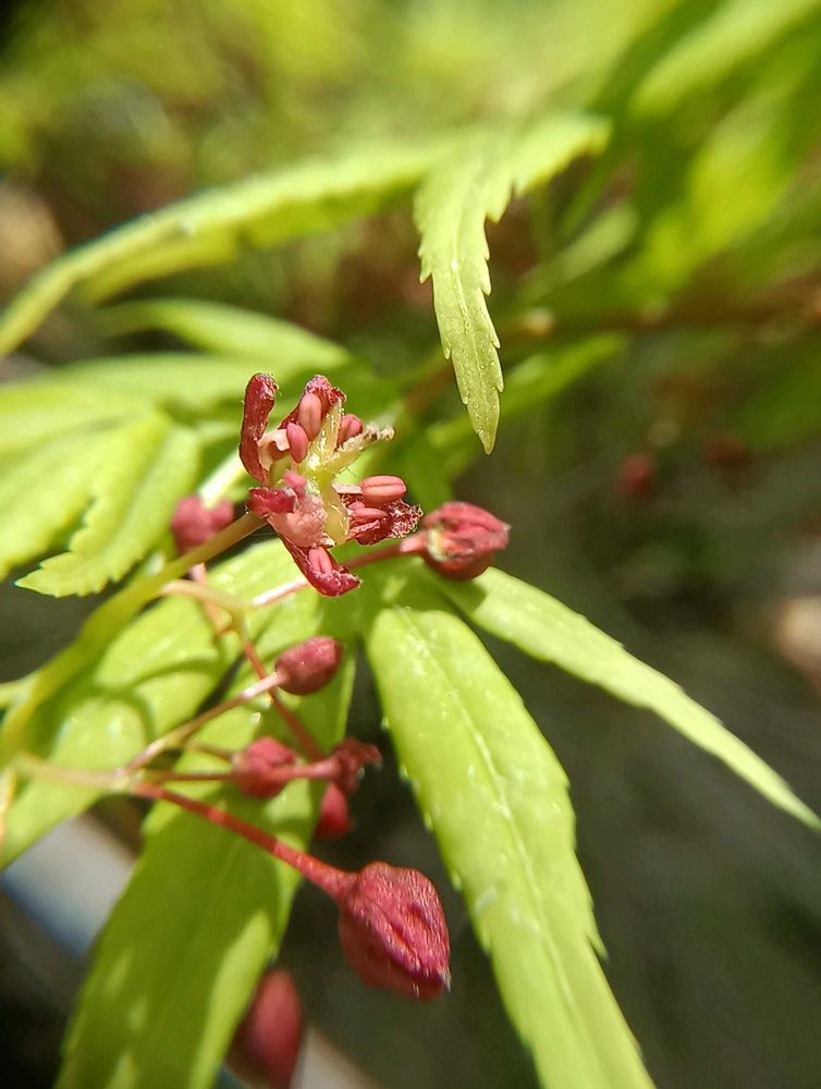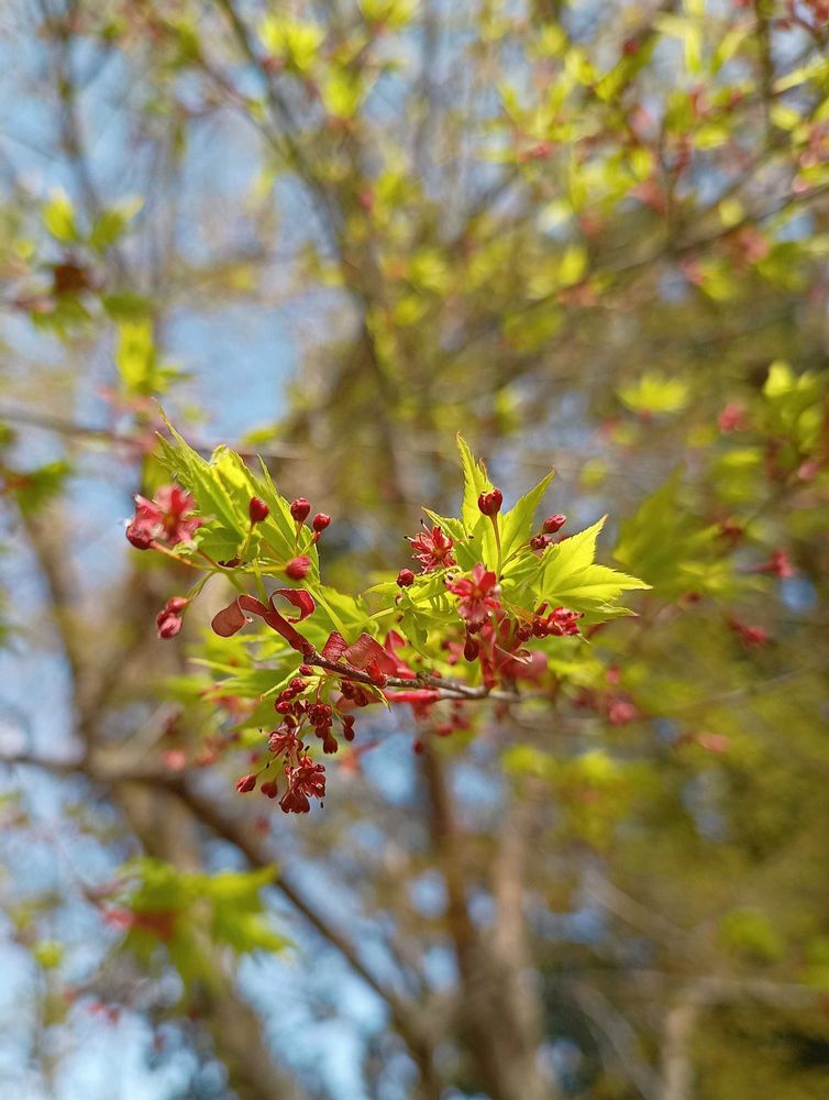 イロハモミジの新芽の時の花〜可愛いよね〜それも両性花や雄花とか分かれてるんだね〜まこちゃんの説明と写真で良く分かりました〜🩷💗💕✨