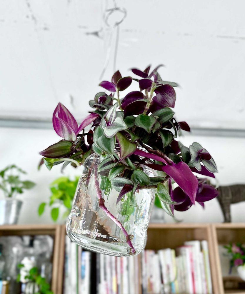 ダイニングテーブル上にトラディスカンティアの水差しハンギング