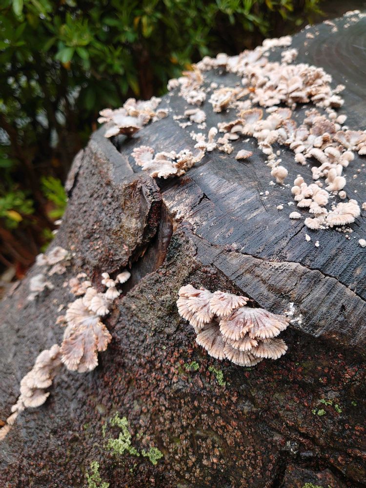 4️⃣スエヒロタケ🍄同じ切り株の端っこに生えていました🍄検索したら🔍️肺スエヒロタケ感染症の危険ありでした⚠️抗がん剤も作られるとも書いてありました😲毒でもあり薬にもなるのね🍄