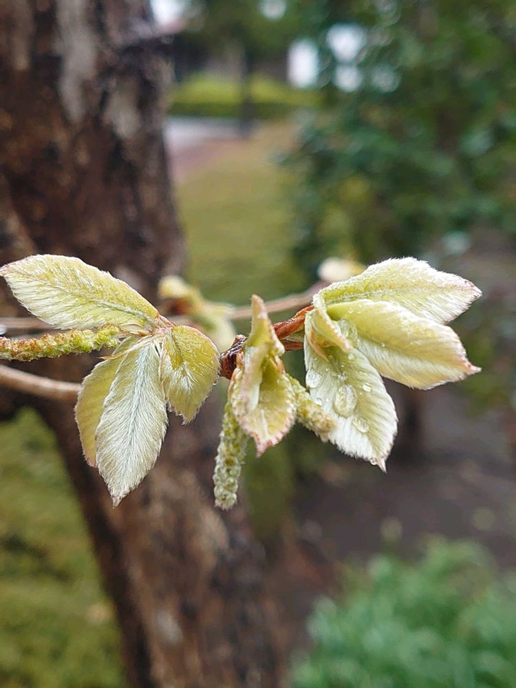 5️⃣コナラの新芽🌱うぶ毛に覆われて柔らかい💧雨上がりの雫纏ってキラリ✨️💧😌