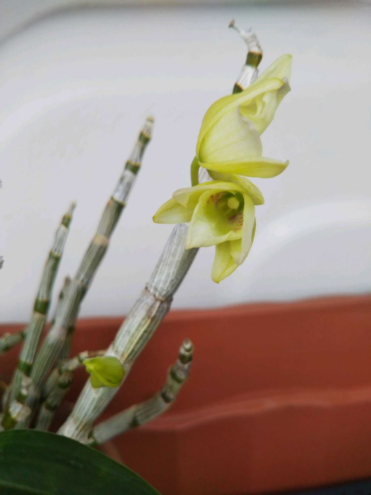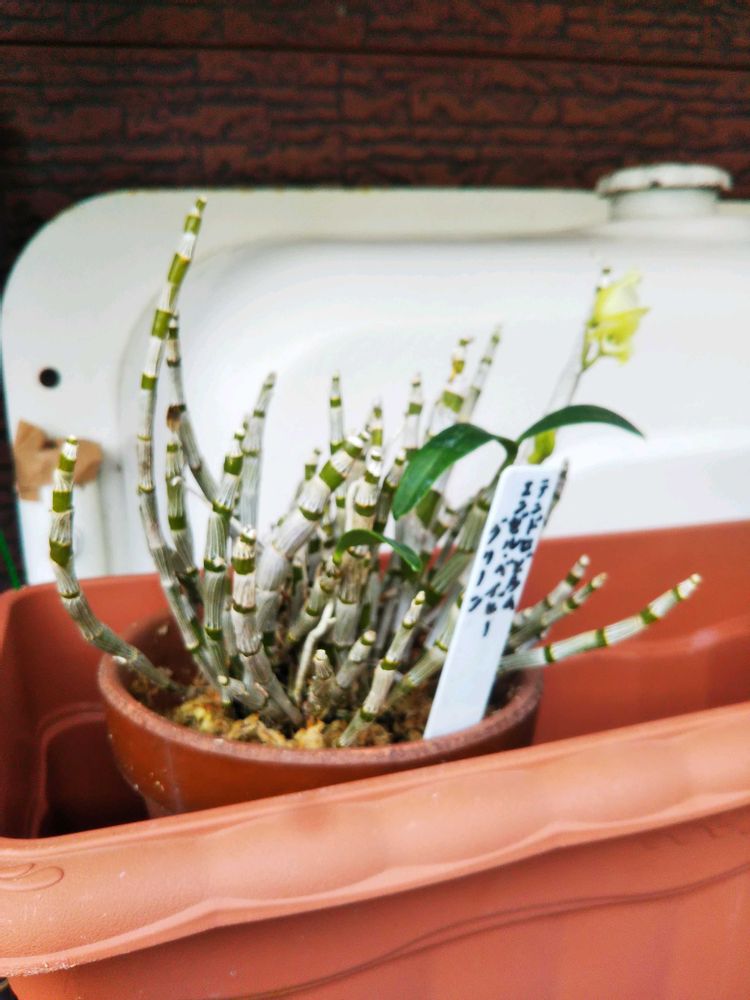<地道投稿>おはようございます☁️1️⃣角鉢(大きい25×30)「春蘭」一輪開花しました(これも母の忠告無視しての株分け鉢😓)長い目で見てください😅2️⃣3️⃣「デンドロビウム エンゼルベイビーグリーン」冬の管理の大切さ痛感した今年、花芽この三個だけ、葉は9割落ちました😣一週間前プラ鉢から素鉢にまとめ、植え(少し早いが)替えして様子見ます。
