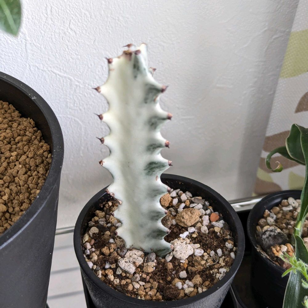 ユーフォルビア・ホワイトゴースト。購入して半年くらいですが動きなしです。枯れてはなさそうですがセール品で恐らく挿し木なのでもう少し暖かくなったら根が出てるか確認のために植え替えです。