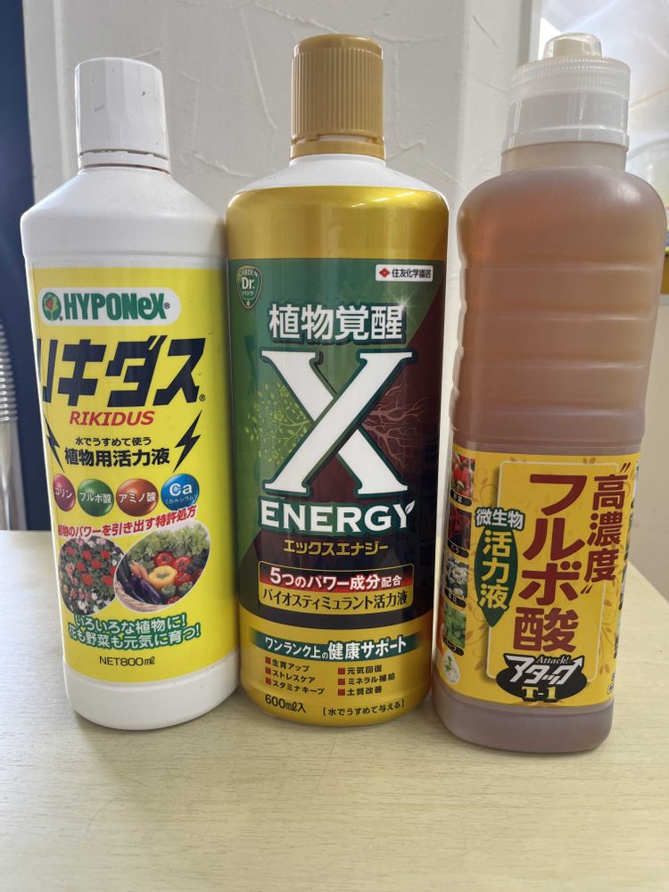 前項でも活性剤をご紹介しましたが今シーズン我が家は以前から使っていたハイポネックス植物活性液の「リキダス」に住友化学のバイオスティミュラント活力液「エックスエナジー」そして花ごころの高濃度フルボ酸「アタックT-1」を使う事にしました。