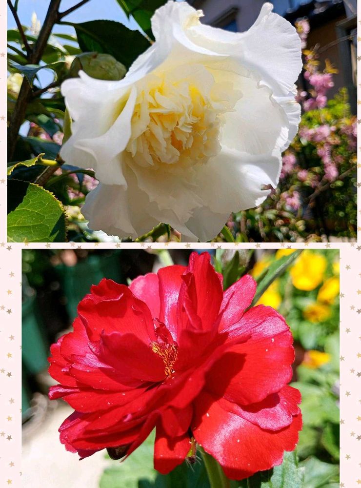 ✤椿「エレガンスシャンパン」2輪目も綺麗に開花🤍。ラナンキュラスのアップも❤️😃📱