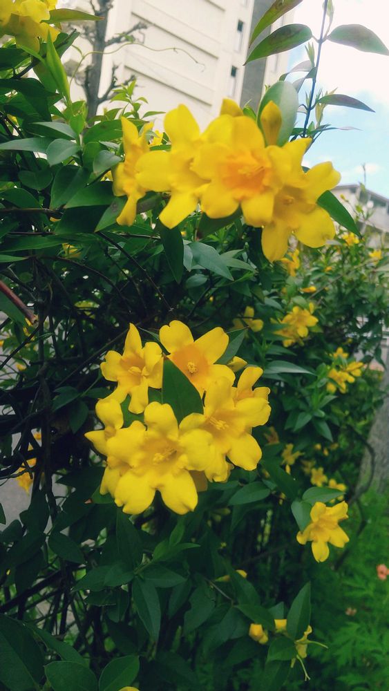 この季節、モッコウバラの黄色にばかり目がいってたけど、カロライナジャスミンのインパクト凄い~🎵