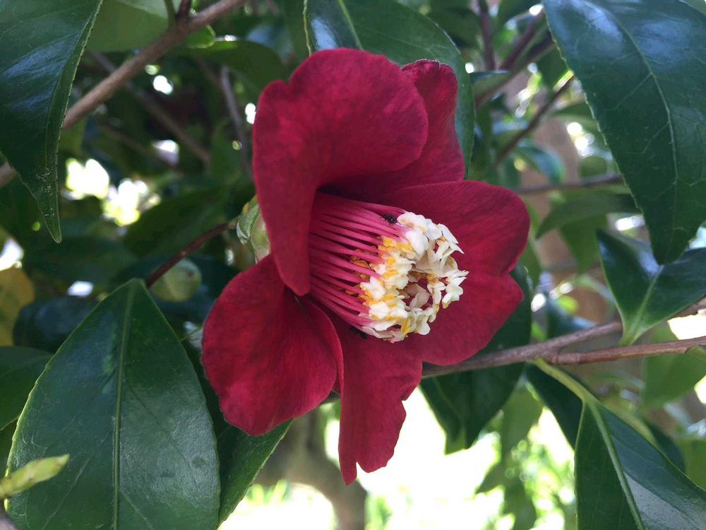 とにかく、深みのある赤の花弁に白い芯の対比が美しい椿ですね(^_-)-☆