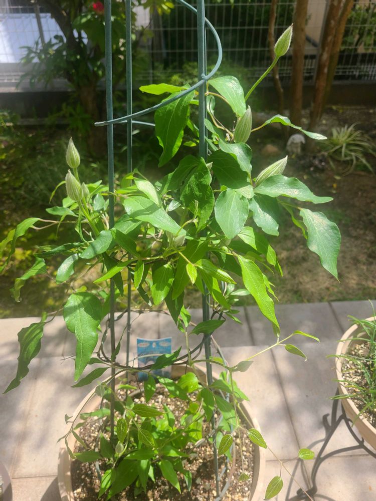 三種混合クレマチスは今、ワッサワッサ状態でやばいです😅 ツルがあっちに出たりこっちに出たりどこにまとめてあげたらいいのやら誘引はどうしたら良いのやら ツボミもたくさん出て来ているのは嬉しいのですが平均して綺麗に咲いてくれるのかどれがどの色か分からないもんだからもーぐちゃぐちゃです😤