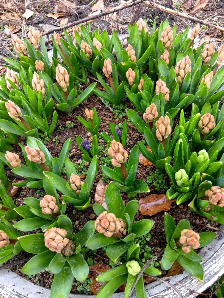ヒヤシンス 毎年鉢植えを買い春に地植えをしていたら 今年こんなに花芽が 私もビックリ