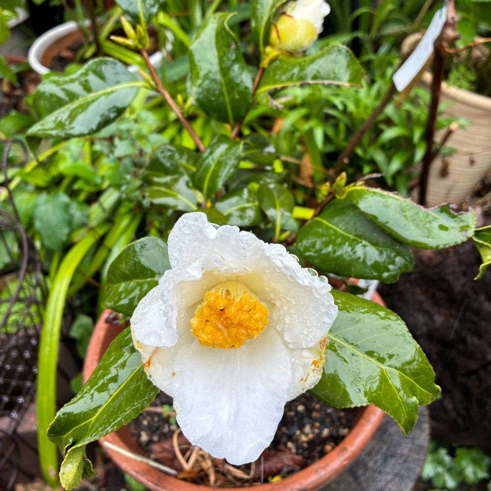 🏷️白い水曜日 に金魚の尾っぽのような錦魚葉椿が咲きました!!調べていてピンク色もあるのを知りました🩷