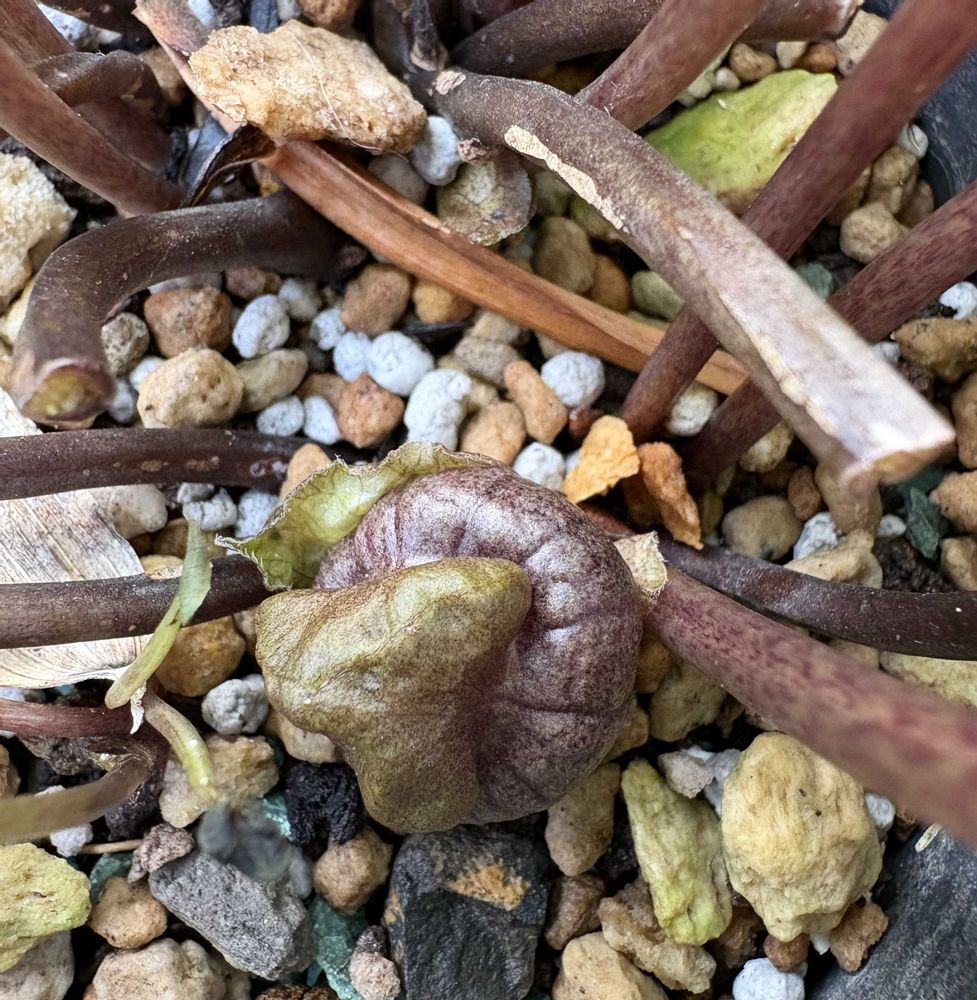 カンアオイの古い葉っぱを切ったら花が見えてきました