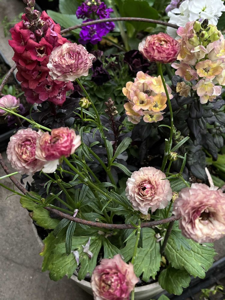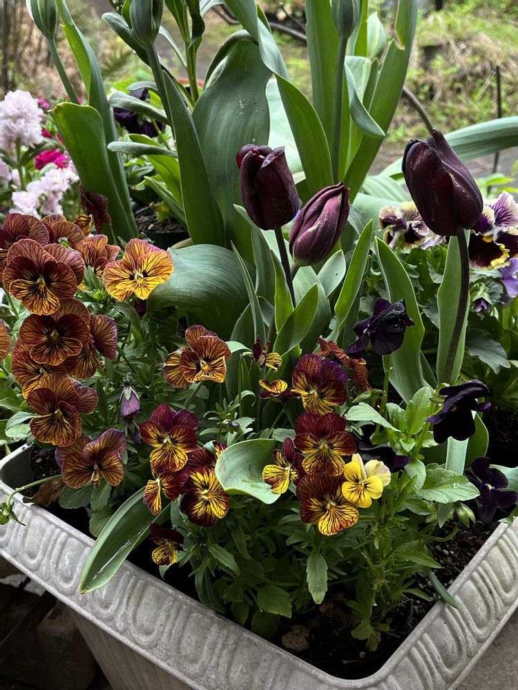 ❶チューリップ コンチネンタルのコンテナにコラボしたビオラ タイガーアイレッド(種蒔き組)✨✨渋渋〰️🙆♀️❷ラナンキュラス ラックスアイオリア✨とアンテリナムショコラグレース✨✨こちらも渋渋〰️🙌❸チューリップのコンテナ✨✨開花して来たら軒下に…軒下大渋滞💦💦