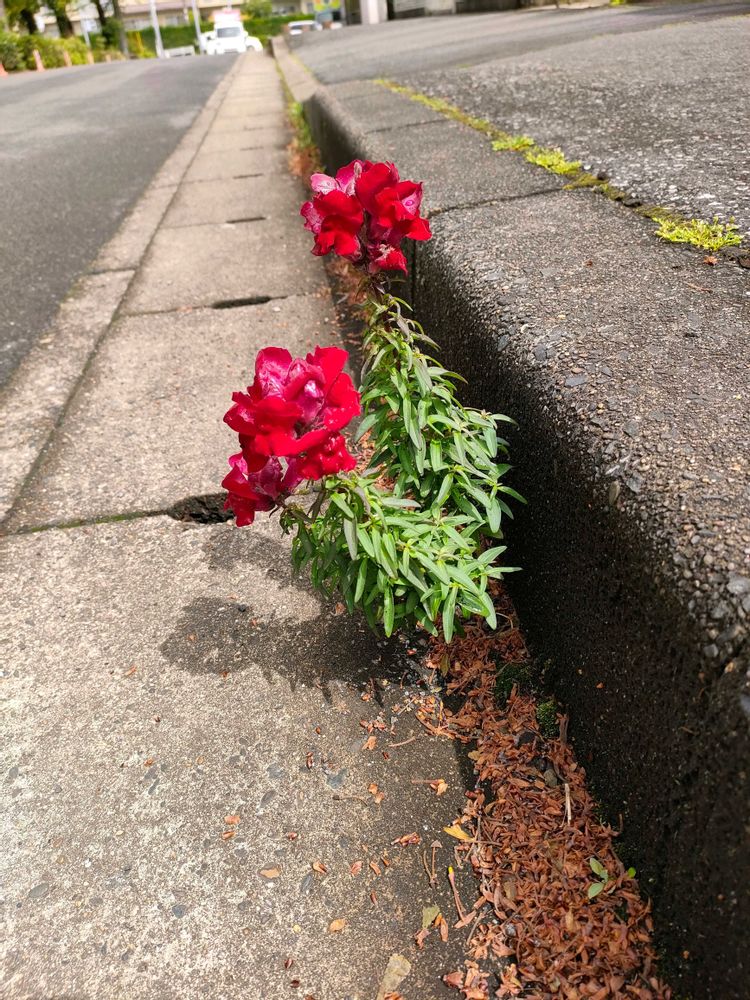 路側溝の蓋の隙間に生えたキンギョソウです。
